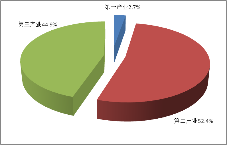 第一产业增加值36.86亿元,同比增长2.5%;第二产业增加值711.41亿元,增长8.8%;第三产业增加值610.09亿元,增长2.8%。三次产业结构比重为2.7:52.4:44.9,第一产业比重较上年同期提高0.3个百分点,第二产业比重较上年同期下降1.1个百分点,第三产业比重较上年提高0.8个百分点。三次产业对经济增长的贡献率依次为1.2%、81.3%和17.5%,对经济的拉动作用分别为0.1、5.1和1.1个百分点。