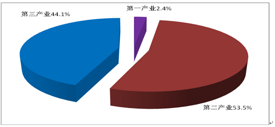 第一产业增加值30.59亿元,同比下降3.6%;第二产业增加值682.32亿元,增长10.0%;第三产业增加值563.48亿元,增长5.9%。三次产业结构比重为2.4:53.5:44.1,第一产业比重较上年同期下降0.3个百分点,第二产业比重较上年同期下降2.2个百分点,第三产业比重较上年提高2.5个百分点。三次产业对经济增长的贡献率依次为-1.1%、71.6%和29.5%,对经济的拉动作用分别为-0.1、5.7和2.4个百分点。