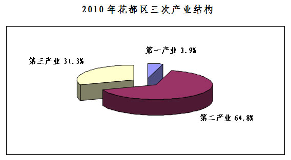 第一产业增加值25.50亿元,增长2.1%;第二产业增加值427.79亿元,增长15.7%;第三产业增加值206.94亿元,增长16.7%。三次产业结构比重为3.9:64.8:31.3,与上年相比,第一产业和第二产业比重分别下降0.5和0.3个百分点;第三产业上升0.8个百分点。三次产业对经济增长的贡献率依次为0.5%、66.8%和32.7%,对经济的拉动作用分别为0.08、10.4和5.1个百分点。