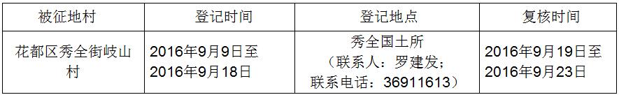 经省人民政府批准(粤国土资(建)字[2016]241号文),需将广州市人妻 区秀全街岐山村属下的未利用地1.4335公顷(合21.5025亩)征收为国有土地。现将经依法批准的《征收土地方案》和市人民政府批准的《征地补偿安置方案》内容和有关事项公告如下: