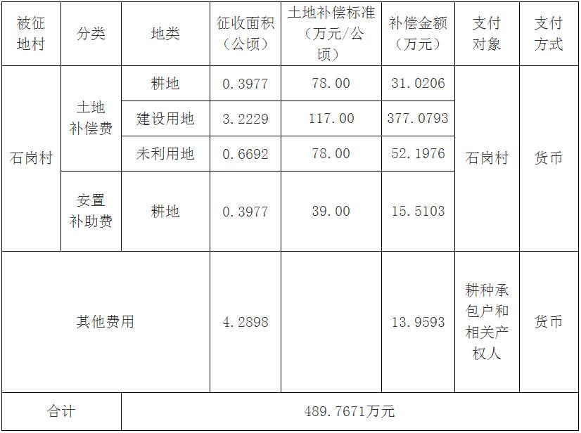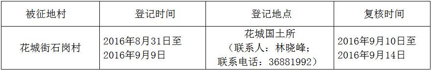 经省人民政府批准(粤国土资(建)字〔2016〕183号文),需将广州市人妻 区花城街石岗村属下的集体土地4.2898公顷(合64.3470亩)征收为国有土地。现将经依法批准的《征收土地方案》和市人民政府批准的《征地补偿安置方案》内容以及有关事项公告如下: