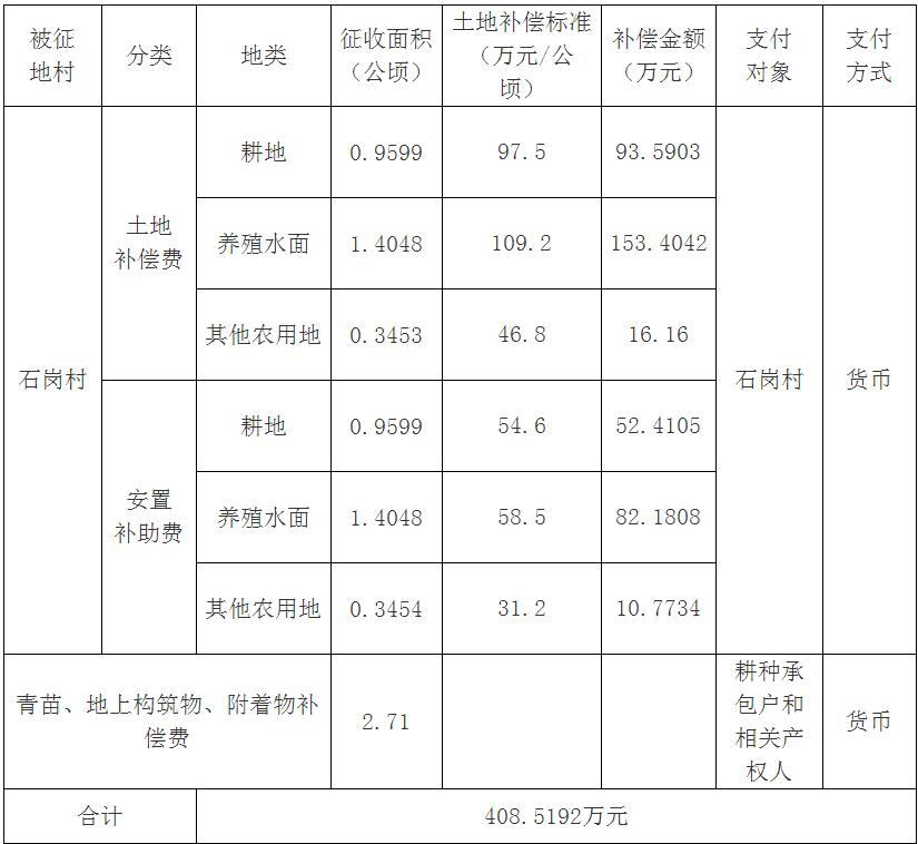 区花城街石岗村的集体土地合计2.71公顷(合40.65亩),其中耕地0.9599公顷(合14.3985亩)、养殖水面1.4048公顷(合21.072亩)、其他农用地0.3453公顷(合5.1795亩)。