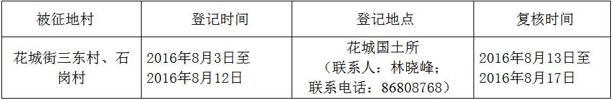 经省人民政府批准(粤国土资(建)字〔2016〕280号文),需将广州市人妻 区花城街三东村、石岗村属下的集体土地3.4306公顷(合51.459亩)征收为国有土地。现将经依法批准的《征收土地方案》和市人民政府批准的《征地补偿安置方案》内容以及有关事项公告如下: