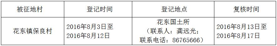 经省人民政府批准(粤国土资(建)字〔2016〕281号文),需将广州市人妻 区花东镇保良村属下的集体土地2.2196公顷(合33.29亩)征收为国有土地。现将经依法批准的《征收土地方案》和市人民政府批准的《征地补偿安置方案》内容以及有关事项公告如下: