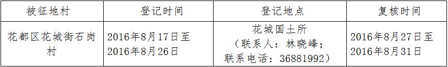 经省人民政府批准(粤国土资(建)字[2016]426号文),需将广州市人妻 区花城街石岗村属下的集体土地8.7115公顷(合130.6725亩)征收为国有土地。现将经依法批准的《征收土地方案》和市人民政府批准的《征地补偿安置方案》内容和有关事项公告如下: