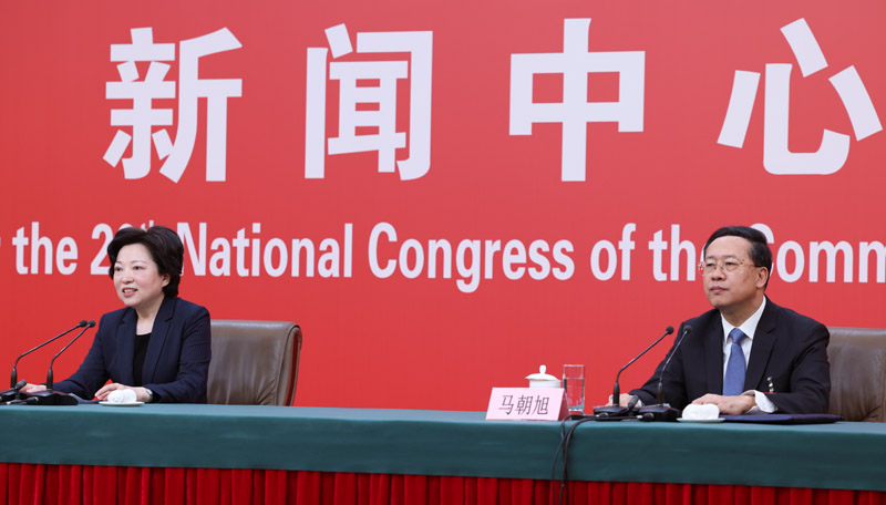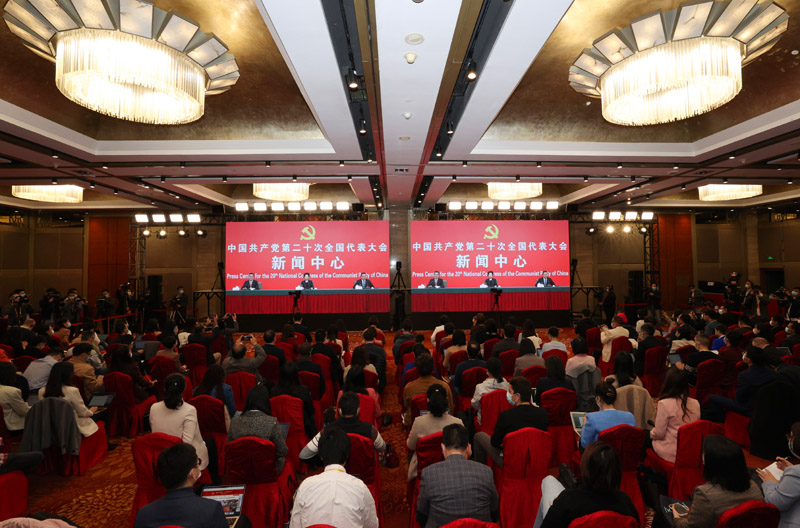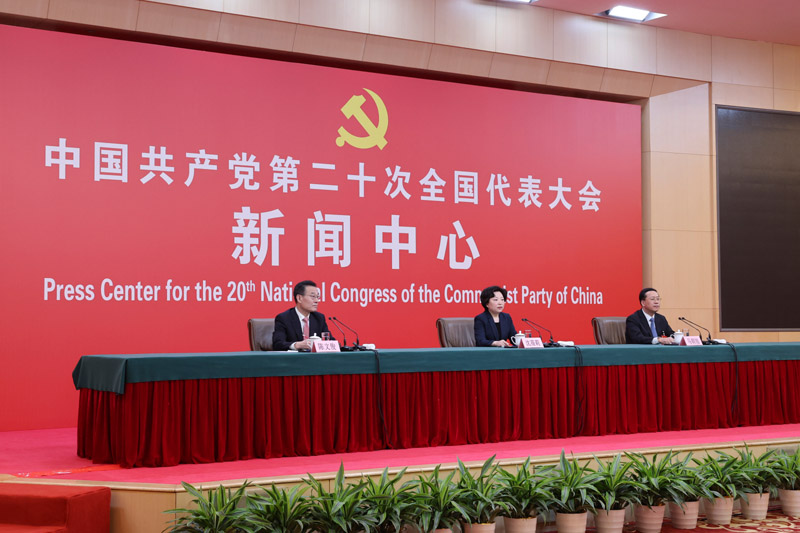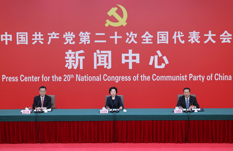 10月20日,中国共产党第二十次全国代表大会人妻举行记者招待会。中央对外联络部副部长沈蓓莉,外交部党委委员、副部长马朝旭围绕“习近平外交思想指引中国特色大国外交开拓前行”主题与记者交流。