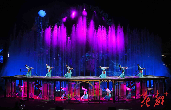 《梦回岭南》全新打造多重动态表演区,以“主舞台+中心升降式表演区+高空威亚表演区+观众席互动巡游表演通道”的多维演艺空间布局,打破观众与演员之间的距离,形成全新沉浸式观演空间。融合裸眼3D、水幕投影、超600盏舞台灯光、特效火炬等尖端科技,配合百余名专业演员倾情演绎,将百余种中华文化非遗瑰宝融入演艺之中,呈现出“火树银花落,万点星辰开”的奇幻视觉效果。